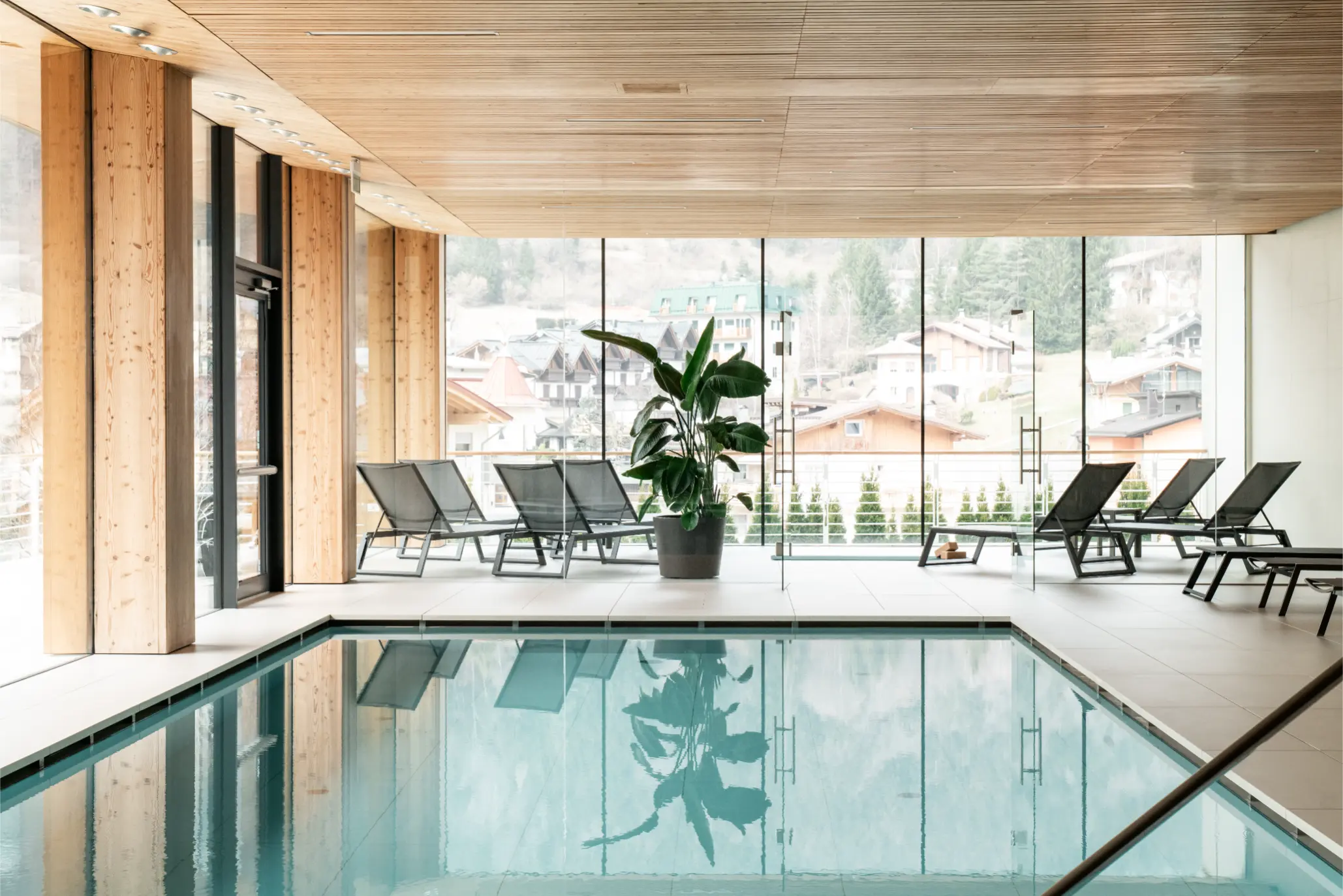 Nel nostro hotel ad Andalo potrai immergerti nella piscina interna ed esterna con acqua ionizzata al sale, riscaldata a 32°.